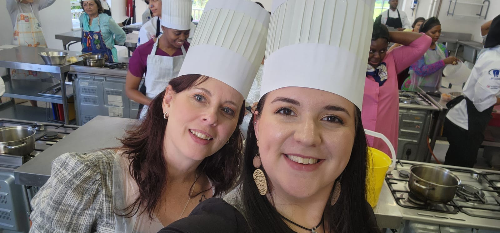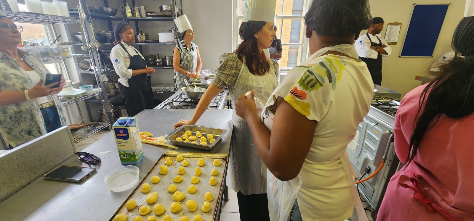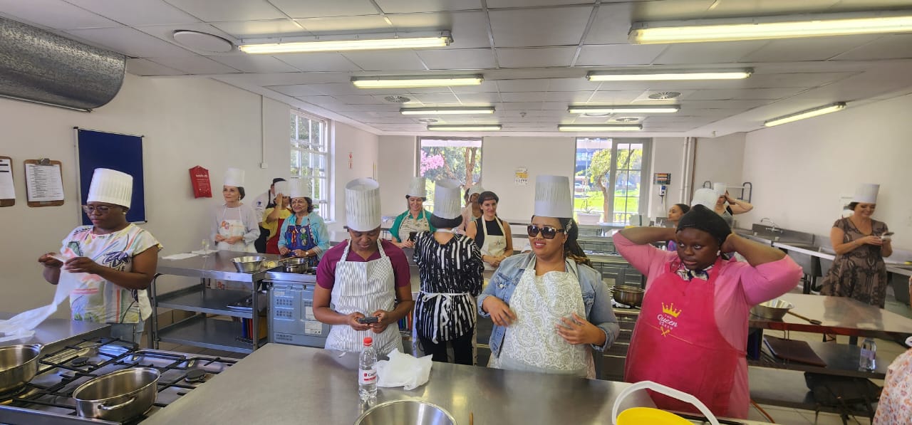 Led by one of the knowledgeable Chefs and lecturers at Capsicum Studios, we were guided to one of their impressive kitchens. Donning aprons and chef hats (with a playful reminder that there were to be no “naked chefs” in his kitchen!), we eagerly prepared for the culinary adventure ahead. It was quite the sight to see a room full of women, dressed up for high tea, donning hairnets in preparation for our baking session!